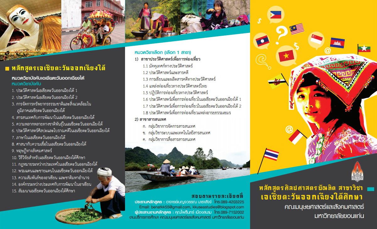 สนใจศึกษารายละเอียดเพิ่มเติมได้ที่นี่ http://kkuseastudies.blogspot.com/ หรือสอบถามได้ที่ ดร.เบญจวรรณ นาราสัจจ์ email: bennar@kku.ac.th หรือสอบถามข้อมูลได้ที่ งานบริการการศึกษา คณะมนุษยศาสตร์และสังคมศาสตร์ มหาวิทยาลัยขอนแก่น โทรศัพท์ 0-4320-4537 เบอร์ภายใน 44569 หรือที่เว็บไซต์ http://www.huso.kku.ac.th