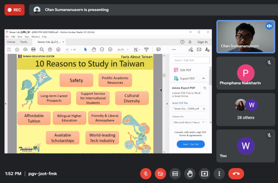 วันอาทิตย์ที่ 8 สิงหาคม 2564 เวลา 13.00-16.00 น. สาขาวิชาเอเชียตะวันออกเฉียงใต้ศึกษา คณะมนุษยศาสตร์และสังคมศาสตร์ มหาวิทยาลัยขอนแก่น ได้จัดกิจกรรมอบรมและแนะแนว “การเรียนต่อและขอทุนไต้หวัน” ผ่านโปรแกรม Google Meet โดยได้รับเกียรติจากอาจารย์โอฬาร สุมนานุสรณ์ อาจารย์ประจำสาขาวิชาภาษาจีนธุรกิจ คณะศิลปศาสตร์ สถาบันการจัดการปัญญาภิวัฒน์ มาเป็นวิทยากรบรรยายในกิจกรรมดังกล่าว