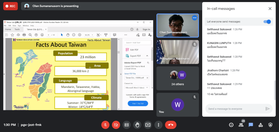 เมื่อเวลา 15.30 น. ซึ่งเป็นช่วงท้ายของกิจกรรม ท่านวิทยากรก็ได้พาเข้าสู่ช่วง Q&A ถาม-ตอบข้อสงสัยและความสนใจเกี่ยวกับทุนไต้หวันผ่านลิงก์ออนไลน์ที่ได้ให้ไว้ช่วงต้นกิจกรรม ซึ่งก็ได้มีนักศึกษาเข้ามาฝากคำถามและข้อสงสัยให้วิทยากรได้ร่วมตอบคำถาม หลังจากนั้นจึงเข้าสู่ช่วงปิดท้าย ซึ่งอาจารย์ ดร.จิราธร ชาติศิริ ก็ได้เข้ามาร่วมกล่าวขอบคุณท่านวิทยากรและกล่าวปิดกิจกรรม จึงเป็นการสิ้นสุดกิจกรรมการบรรยายในวันดังกล่าว