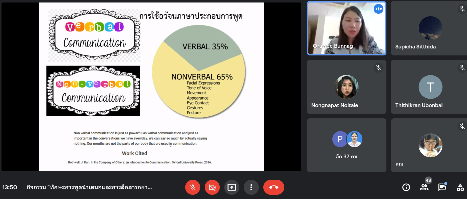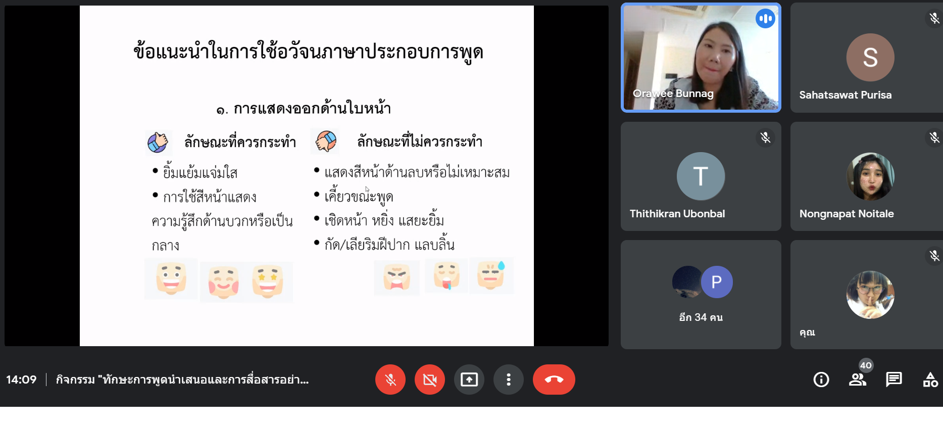 จากนั้น จึงเริ่มเข้าสู่เนื้อหาประเด็นหลักคือ การสื่อสารแบบอวัจนภาษาประกอบการพูดและการนำเสนอหน้าชั้นเรียน ซึ่งระหว่างการพูดประเด็นดังกล่าว อาจารย์ได้ยกตัวอย่างประกอบการอธิบายโดยเฉพาะเรื่องการใช้อวัจนภาษาที่มีความแตกต่างในแต่ละประเทศ การแสดงสีหน้าท่าทาง น้ำเสียง เป็นต้น รวมถึงให้นักศึกษาร่วมถกประเด็นปัญหาการพูดนำเสนอว่ามีอะไรบ้าง คำตอบของนักศึกษามีทั้งการพูดรวบคำ การพูดติดขัด ความตื่นเต้น ฯลฯ อีกทั้งอาจารย์ยังได้ให้ข้อแนะนำ วิธีการแก้ไขปัญหาดังกล่าว อาทิ การฝึกฝน การเตรียมตัวนำเสนอ การเตรียมบทพูดให้เหมาะสมกับเวลา